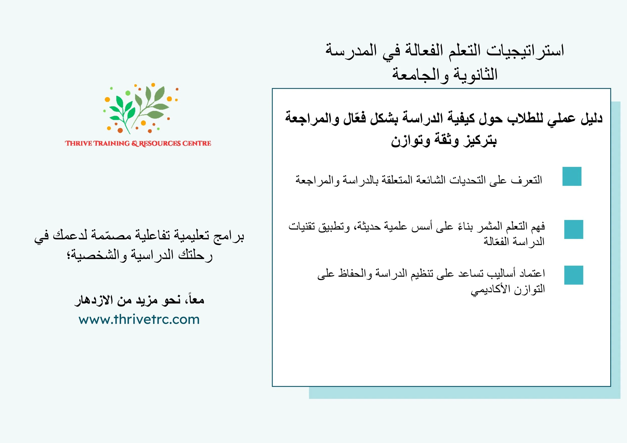 في مركز ثرايف، ندرك أن لكل طالب رحلته الخاصة، سواء في المدرسة الثانوية أو الجامعة. تحمل الحياة الدراسية فرصاً وتحديات وتجارب متنوعة، ويختلف كل مسار عن الآخر