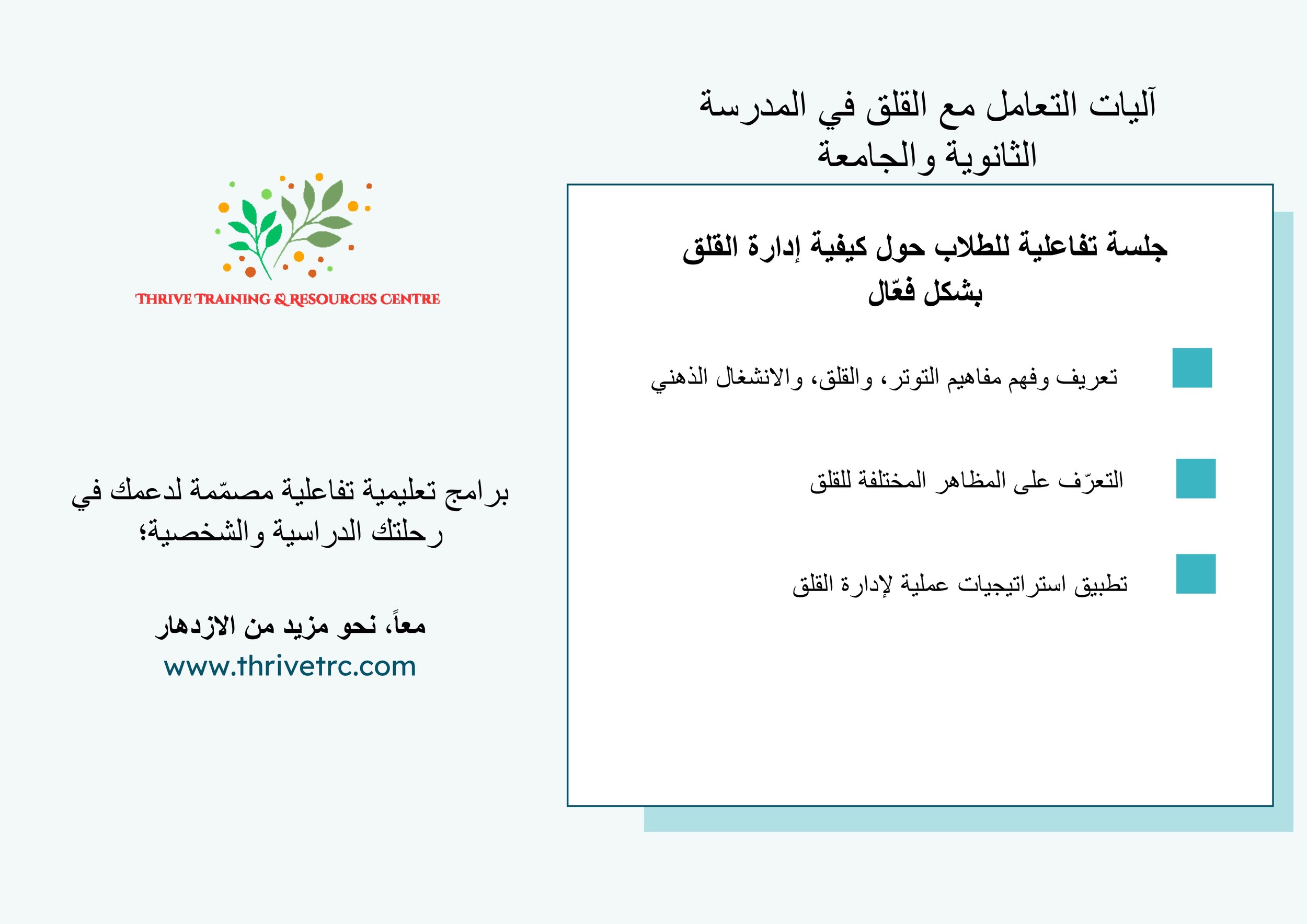 كما نقدّم برنامج إدارة القلق بفعالية، الذي يساعد الطلبة على فهم القلق بشكل أفضل وتعلّم طرق عملية للتعامل معه في بيئة داعمة ومنظمة